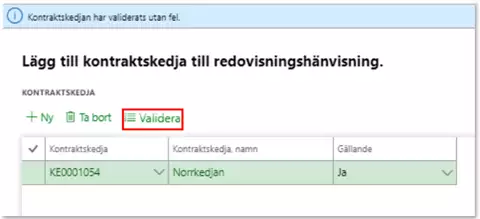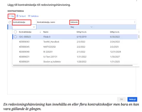 - Gällande. Du anger en eller flera kontraktskedjor och anger vilken av de valda kontraktskedjor som ska användas i redovisningshänvisningen. Detta medför att du måste manuellt växla mellan kontraktskedjor.