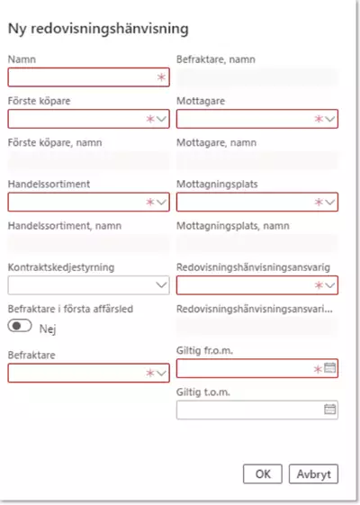 En redovisningshänvisning måste finnas per handelssortiment/mottagare/förste köpare. Detta medför att redovisningshänvisningar är stabila över tid, och behöver bara skapas i följande fall: