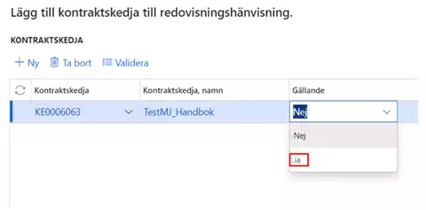21. Välj om kontraktskedjan ska vara gällande eller ej (Notera att detta fält uppstår enbart ifall du har valt kontraktskedjestyrning = Gällande i punkt 9).