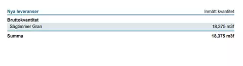 - Inmätt kvantitet: Visar den inmätta bruttokvantiteten alltid sammanställt i måttslag m³f[4] på Nya leveransers första sida.