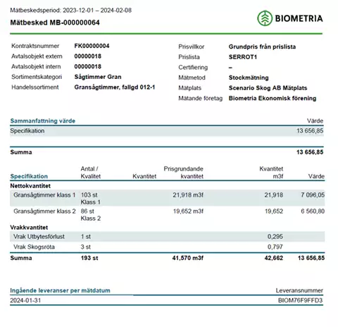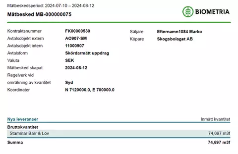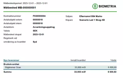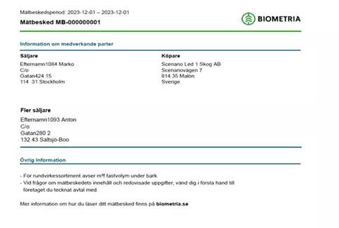 Mätbeskedet innehåller alltid uppgifter om virkessäljare och virkesköpare, samt den period (datum) då mätningarna av leveransen skett.