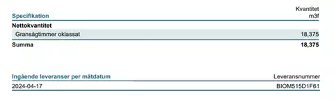 En m³f kvantitet (fastvolym) framgår alltid på mätbeskedet.