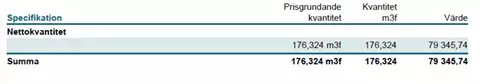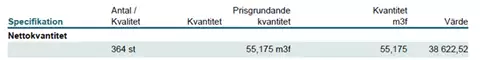Köparen kan också ha valt att ej utredovisa Produkt i värdeberäkningen på stockmätta kvantiteter och där värdeberäkning är satt att gälla i m³f. I det fallet framgår inte produkt på radnivå på Nettokvantiteten på specifikation (som nedan bild). Handelssortimentet på detaljsidans huvud visar i detta fall det inmätta sortimentet. Kvantitet utredovisas då i m³f, fastän mätmetod stockmätning ligger som grund.