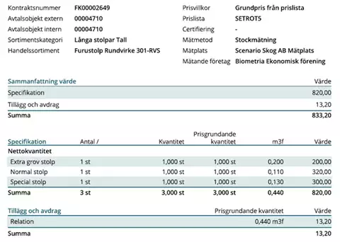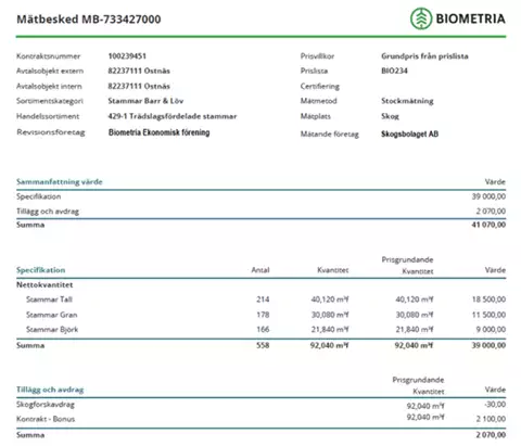 Specifikation: I Specifikationen redovisas kvantiteter och värdeberäkningar. Råvara kan vara stockmätt (som denna mätmetod ovan anger) men utredovisas som ovan i prisgrundande kvantitet m³f. Köparen (Aktören) har valt att kvantiteterna i detta fall skall värdeberäknas på det måttslaget och mot den prislistan. Hur köparen valt att bygga upp sin värdeberäkning/prislista påverkar utseendet av specifikationen i mätbeskedet.