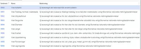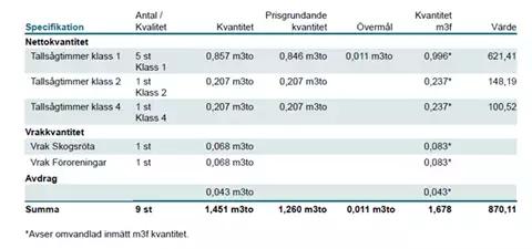 - Det som eventuellt registrerats enligt virkesmätningslagen 9§ (nedklassad/ej godkänd kvantitet) (Se: Skogstyrelsens föresksrifter om virkesmätning)