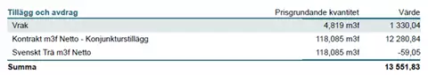 Tillägg och avdrag: Visar också andra överenskomna ersättningar som kan förekomma på kontraktet eller prislistan mellan säljare och köpare, som till exempel Konjunkturstillägg, Svensk Trä m.m. där köparen valt att lägga in värdeberäkning/avdrag mot säljaren i utredovisning på mätbeskedet. I vissa fall kan det förekomma att prisgrundande kvantitet ej utredovisas på Tillägg och avdrag. Detta kan då bero på att värdet ej baseras på kvantitet utan tex en procentuell beräkning (%) ligger som grund för värdet.