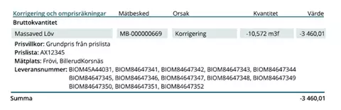 Köparen kan också ha valt att ej utredovisa Produkt, Kvalitet och orsak i värdeberäkningen på massaved. Då framgår inte dessa på mätbeskedet på Nettokvantitetens radnivå (som bild nedan). Handelssortimentet på detaljsidans huvud visar i detta fall det inmätta sortimentet.