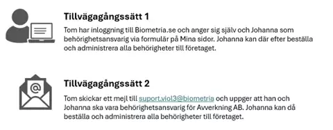 Företag behöver utse en eller flera personer som behörighetansvariga. Den eller de som är behörighetsansvariga ansvarar att rätt personer har åtkomst till företagets affärer i VIOL 3. Behörigheter är också förenade med kostnader. Du kan läsa om kostnaderna på Biometria.se