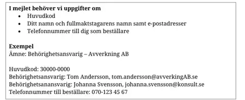 Vid tillvägagångssätt 2 behöver du som behörighetansvarig inkomma med följande information för att vi ska kunna hantera din beställning: