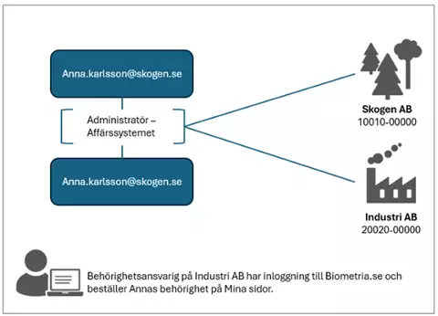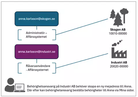Om Anna Karlsson sedan tidigare har behörigheten Administratör - Affärssystemet på företaget Skogen AB och får fullmakt på Industri AB med samma användare (Anna.Karlsson@skogen.se) kommer Anna att ha samma behörighet till affärssystemet på Industri AB.