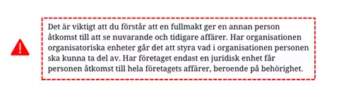 Som vi nämnt i inledningen är det viktigt att du som behörighetsansvarig tar ett aktivt beslut till eventuella fullmakter. Det är viktigt att du förstår att en fullmakt ger en annan person åtkomst till att se nuvarande och tidigare affärer. Har organisationen organisatoriska enheter går det att styra vad i organisationen personen ska kunna ta del av. Har företaget endast en juridisk enhet får personen åtkomst till hela företagets affärer, beroende på behörighet.