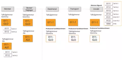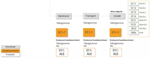 Produktionsunderlaget sätts upp med företagsunika handelssortiment för de sågverk som man avser leverera tallsågtimmer till, Tallsågtimmer Glomma (011-GLO) respektive Tallsågtimmer Ale (011-ALE). Skördaren kan rapportera produkter i uppföljningssyfte. Skotaren skotar sedan respektive företegsunika handelssortiment till väg och särskiljer virket baserat på sortiment. Vid destineringen destineras Tallsågtimmer (011-1) till respektive industri eftersom sågverken önskar inmätning på ett branschgemensamt handelssortiment. För att de mottagande industrierna ska kunna ta del av produktionsresultatet behöver man vid destineringen ange att sortimenten var producerade som Tallsågtimmer Glomma (011-GLO) respektive Tallsågtimmer Ale (011-ALE) för att kunna hitta rätt produktionsunderlag. Transportinstruktionerna skapas efter destineringen och delger information om vilket sortiment som ska köras vart till berörda aktörer i transportaffären. I transportinstruktionen framgår det även att sortimenten är destinerat, och ska