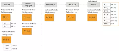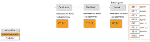 Produktionsunderlaget sätts upp med branschgemensamma handelssortiment och de skiljs åt genom att uppdragsgivaren på sortimentsraderna anger vilken mottagningsplats som sortimentet är producerat för. Genom att ange planerad mottagare på produktionsunderlaget skapas även förutsättningar för att mottagande industri ska kunna ta del av produktionsresultatet vid avverkning. Vid destinering destineras Tallsågtimmer (011-1) till respektive industri. Eftersom destineringen sker till den mottagare som man planerat för vid produktion plan måste man inte ange att sortimentet var producerat för Bohus respektive Heda för fortsatt tillgång till produktionsresultatet, men för att få med detta på mätresultatet behöver detta anges. Transportinstruktionerna skapas efter destineringen och delger information om vilket sortiment som ska köras vart till berörda aktörer i transportaffären. Trots att samma handelssortiment producerats vid avverkning har de skilts åt på dess mottagare så de är tydligt för transportföretag vilket avlägg som ska köras vart. Vid inmätning mäts Tallsågtimmer (011-1) in och produktfördelas utifrån respektive siteunika produktlista.