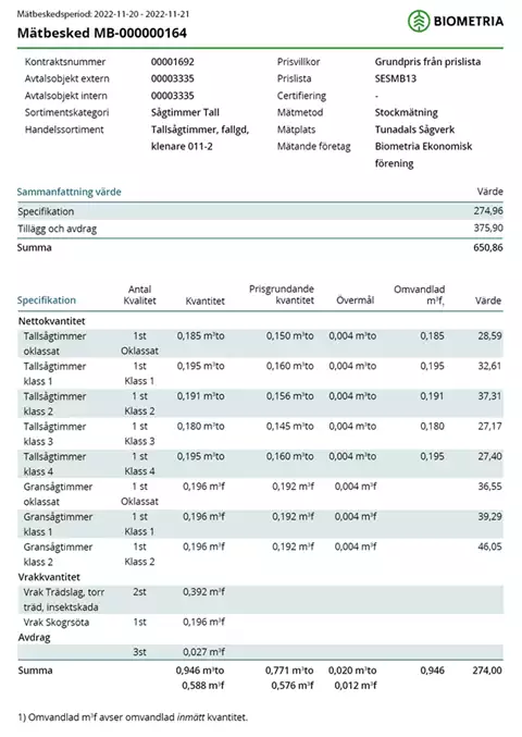 Tidigt i mätbeskedet finns en sida med översiktliga sammanställningar brutet per ingående handelssortiments sortimentskategori. Exempelvis redovisas flera förekomster av handelssortiment med tallsågtimmer här tillsammans som sortimentskategori ”Sågtimmer Tall”. Detta är just en översiktlig sammanställning för att tidigt ge en överblick över helheten i det aktuella mätbeskedet.