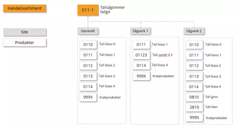 aviseras som, Tallsågtimmer (011-1) men att det vid väg ligger producerat som bland annat Tallsågtimmer Glomma (011-GLO). Vid avlägg ligger sortimenten uppdelade utifrån sortiment Tallsågtimmer Glomma (011-GLO) och Tallsågtimmer Ale (011-ALE). Virket aviseras och mäts in som Tallsågtimmer (011-1). Vid inmätning mäts Tallsågtimmer (011-1) in och produktfördelas utifrån respektive siteunika produktlista.