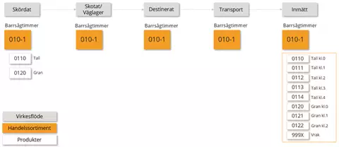 Produktion sätter upp produktionsunderlaget med handelssortimentet Tall- & Gransågtimmer (010-1) för att hantera avverkningen i blandning. Möjlighet finns att skördarrapportera produkter för uppföljning. Skotare skotar ut Tall- & Gransågtimmer (010-1) till väg. Vid destineringen destineras Tall- & Gransågtimmer (010-1) eftersom det är detta sortiment som mäts in.
