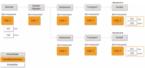 Produktionsunderlaget sätts upp med handelssortiment Barrmassaved (100-1) utan att planerad mottagare anges eftersom tillredningen inte skiljer sig åt beroende på mottagare. Skördaren kan rapportera produkter Tall (101) och Gran (102) i uppföljningssyfte. Skotaren skotar ut Barrmassaved (100-1) till väg. Destineringsansvarig destinerar Barrmassaved (100-1) till möjliga industrier för inmätning. Genom de då skapade transportinstruktionerna får berörda aktörer inom transport information om att de kan köra in Barrmassaved (100-1) mot angivna industrier. Transporten planeras i detta fall utifrån industribehov och väglager utan att behöva ta hänsyn till att sortimentet är producerat för en viss mottagningsplats. Massabruken får virket inmätt som Barrmassaved (100-1) och får en fördelning mellan tall och gran i enlighet med det branschgemensamma handelssortimentets standarduppsättning.