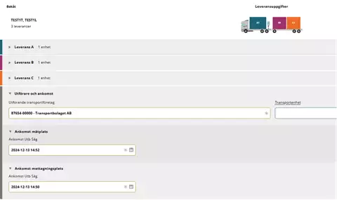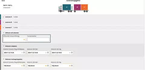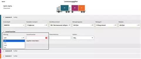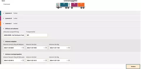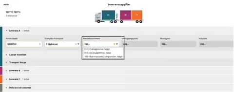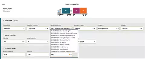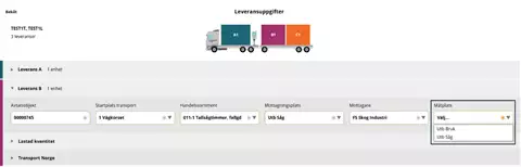 Valitse "Utförande transportföretag" (suorittava kuljetusyritys)-kohdan pudotusvalikossa kuljetuksen suorittava kuljetusyritys. On tärkeää, että valitset oikean suorittajan, jotta arvolaskelma ja seuranta kuljetusyhtiölle, jonka palveluksessa ajat, on oikea.