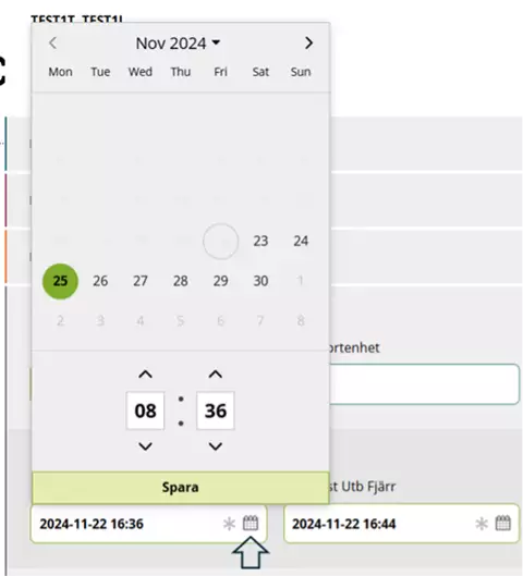 Kirjoita kohtaan "Ankomst mätplats" (saapuminen mittauspisteeseen) päivä ja kellonaika, jolloin sinun odotetaan saapuvan mittauspisteeseen. Päivämäärän ja kellonajan on aina oltava Ruotsin aikaa, vaikka olisit toisessa maassa.