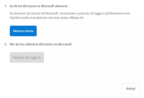Jos sinulla ei ole Microsoft- tai Google-tiliä, sinua pyydetään aktivoimaan sähköpostiosoitteesi Microsoftilla. Microsoft-aktivointi edellyttää Microsoft-salasanan hankkimista, jota voidaan käyttää kirjautumiseen Biometriaan.