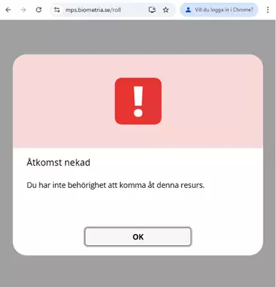 Jos saat tämän virheilmoituksen, se tarkoittaa, että sinulla ei ole valtuutusta tai että valtuutusta ei ole vielä aktivoitu. Ota yhteyttä valtuutuspäällikköön yrityksessä jolle työskentelet.