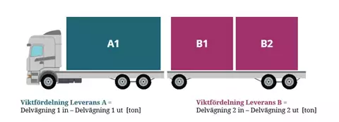 Kuljettaja ilmoittaa yhdestä toimitustapahtumasta kahdella toimituksella. Osapunnitus on suoritettava sekä sisään- että ulospunnituksessa. Yksi osapunnitus vetoautoa varten ja toinen perävaunua varten jotka sisältävät eri sopimuskohteita. Punnituksia tehdään yhteensä neljä.