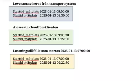 Exempel på skillnader på ett och samma leveranstillfälle beroende på hur det är aviserat. Bilen kör in genom grindarna 2025-01-13 kl. 09:05 och lämnar 2025-01-13 kl. 09:23.