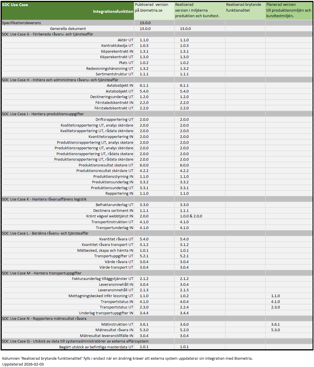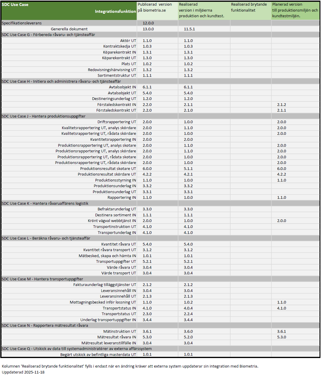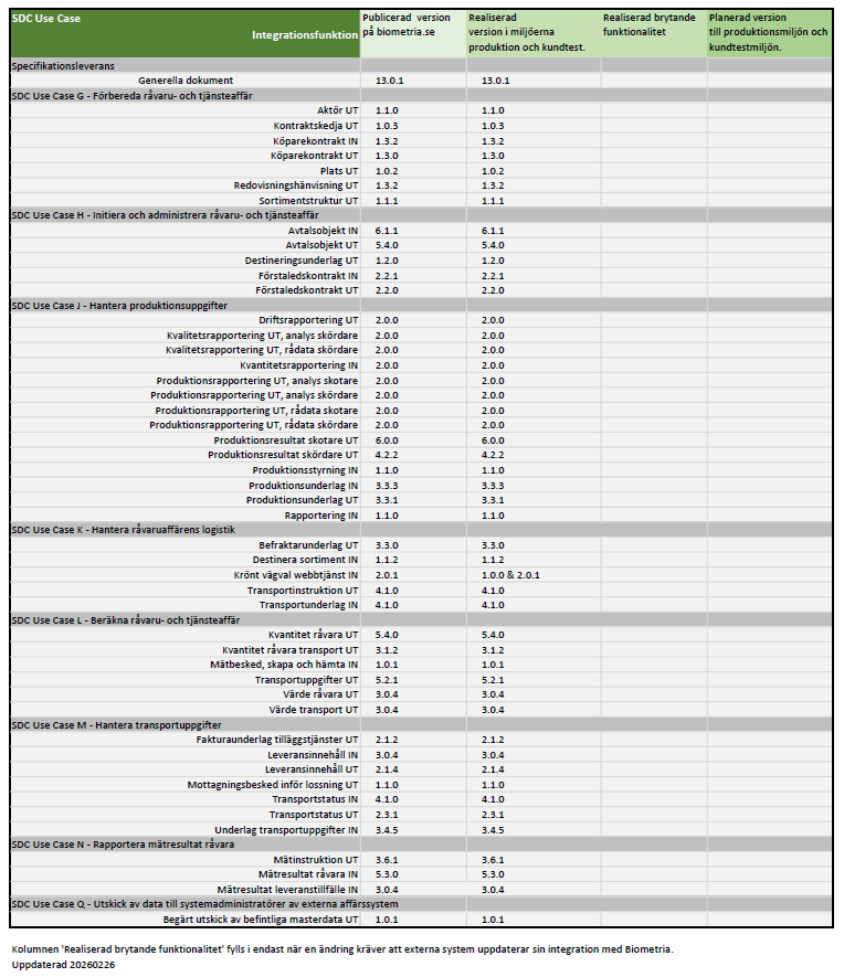 Nedan beskrivs vilken version av Integrationsfunktionen som är implementerad i kundtestmiljön och vilken version som är publicerad i den senaste specifikationsleveransen.